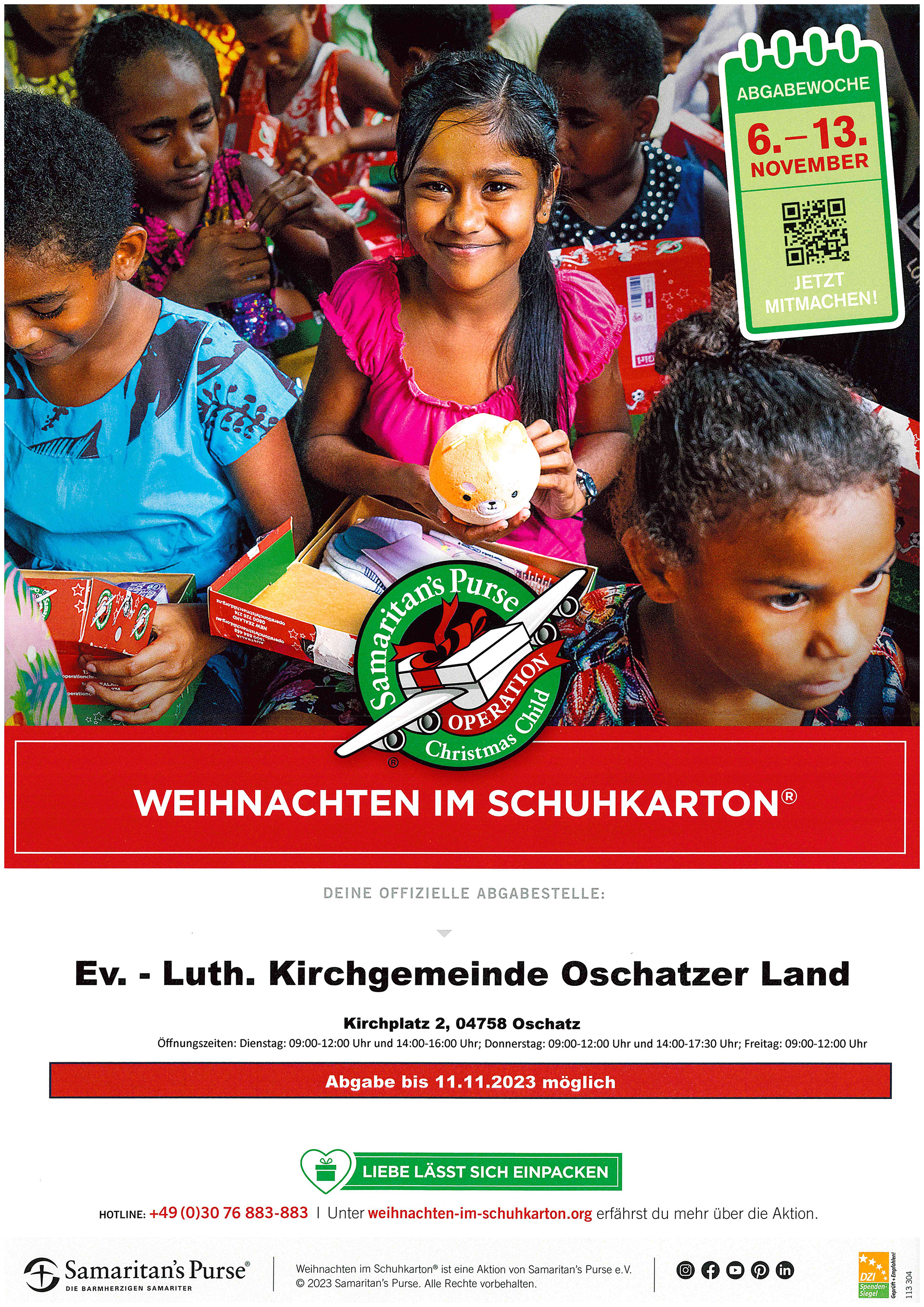 Bis zum 11.11.2023 kann der Karton dann im Pfarramt Oschatz (Kirchplatz 2, 04758 Oschatz) abgegeben werden.