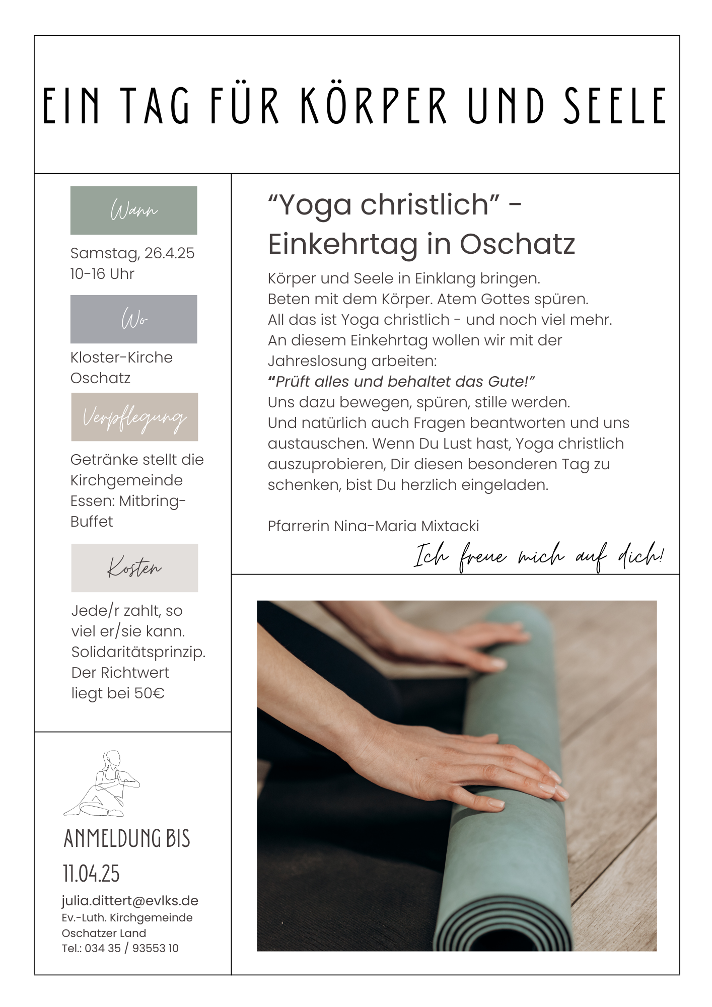 Wenn Du Lust hast, Yoga christlich auszuprobieren, Dir einen besonderen Tag zu schenken, bist du herzlich eingeladen