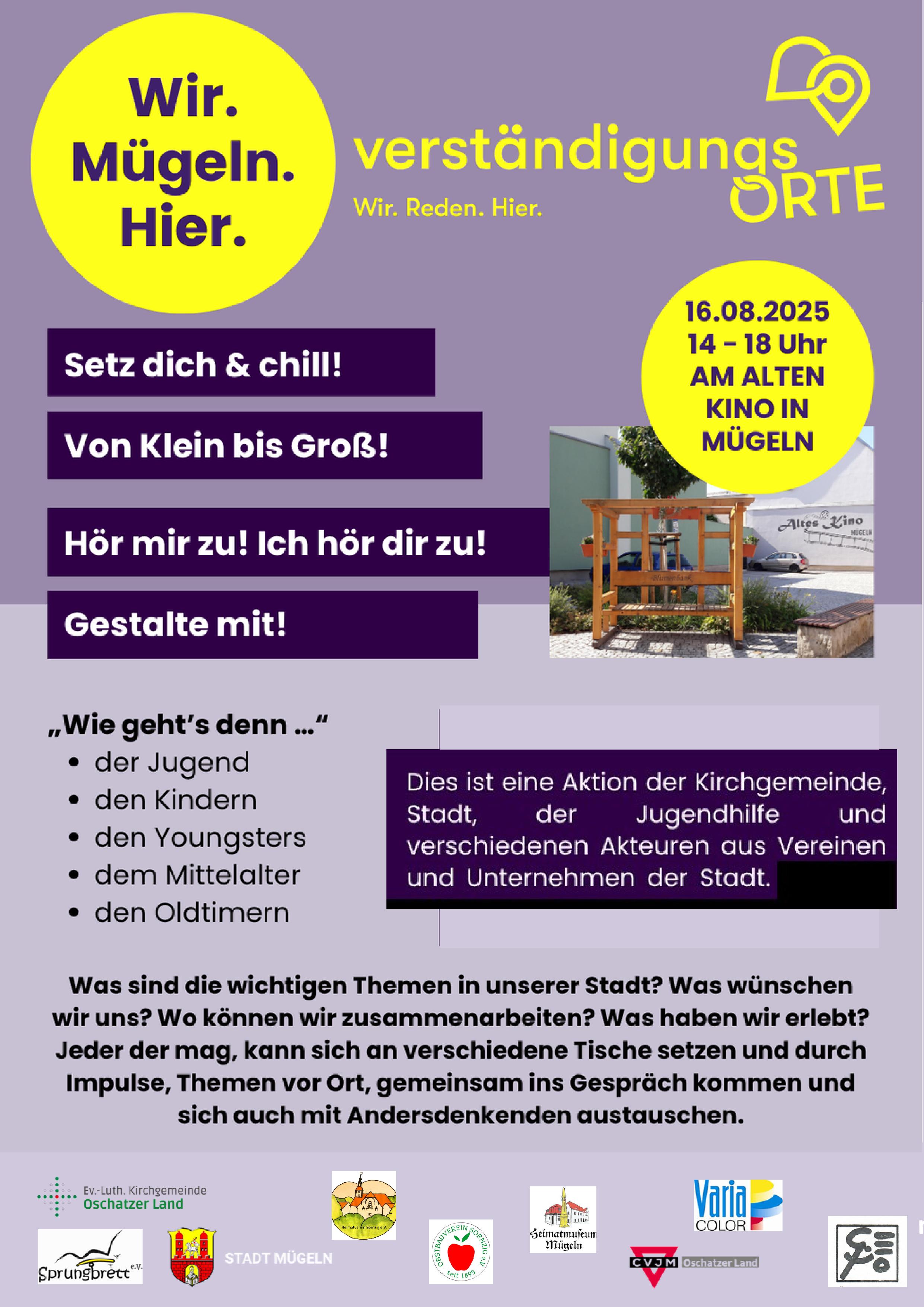 Beim Stadtfest in Mügeln startete das Projekt #Verständigungsorte – Wir.Reden.Hier.. Ziel ist es, einen offenen Begegnungsraum zu schaffen – für Nachbarinnen und Nachbarn, für Menschen eines Ortes, auch wenn sie unterschiedlicher Meinung sind.
