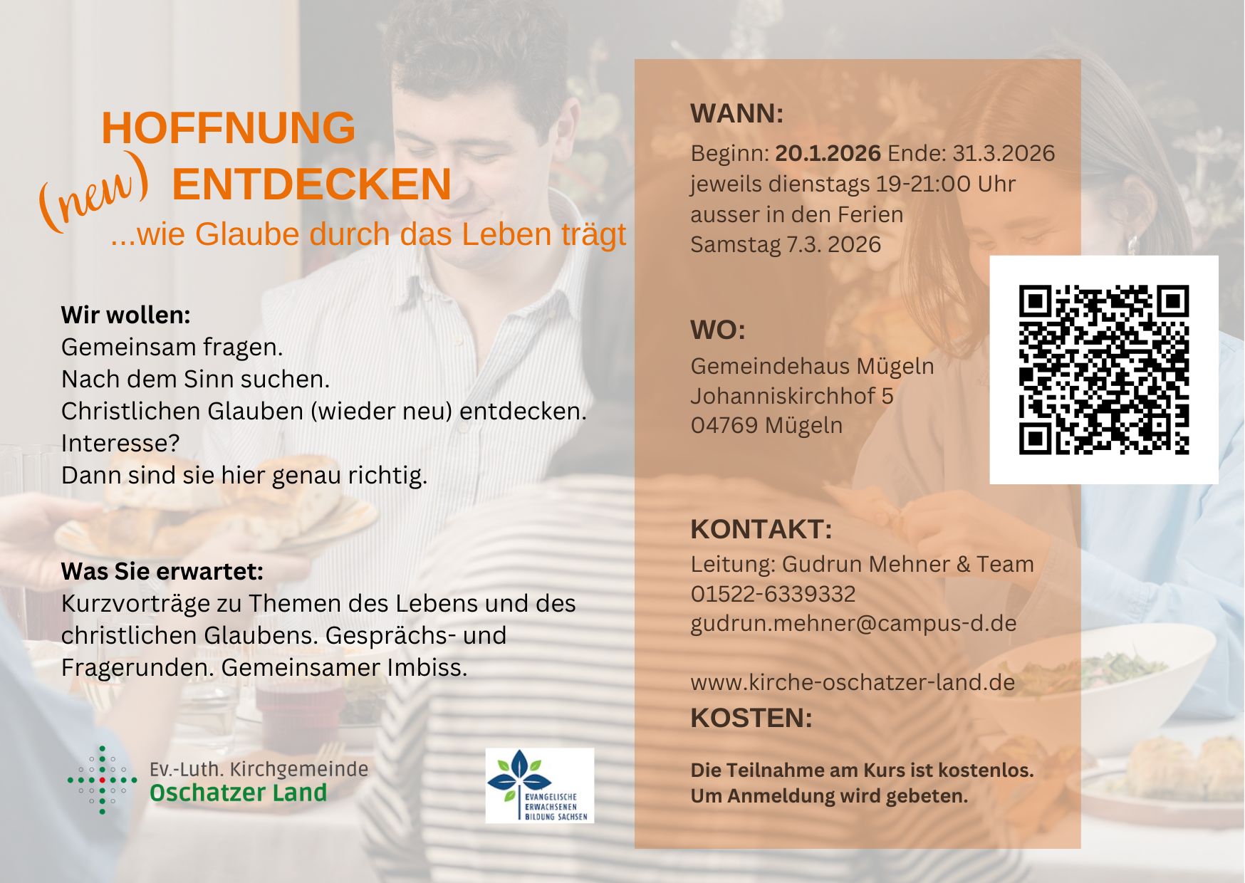 Unsere Zeit ist geprägt von Unsicherheit, Fragen und Sorgen um die Zukunft. Was gibt Halt? Was schenkt Hoffnung? Die Kirchgemeinde Oschatzer Land lädt zu einem Glaubenskurs ein, der Raum für Austausch, Fragen und neue Perspektiven eröffnet.