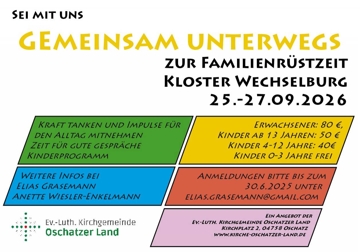 Auch in diesem Jahr wollen wir gemeinsam unterwegs sein zur Familienrüstzeit in Wechselburg. Das Gästehaus des Klosters, eingebettet in eine wunderschöne Landschaft zwischen Wald und Mulde, bietet alles, was es braucht, um dem stressigen Alltag für eine Weile zu entfliehen.