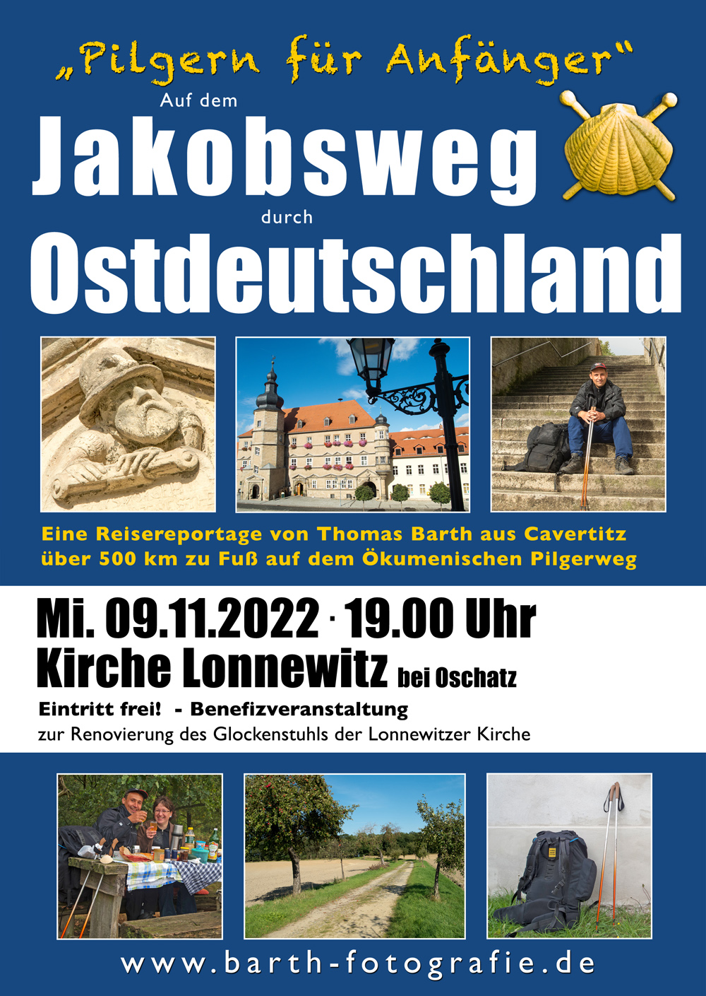 Der Abend mit Thomas Barth stellt die erste öffentliche Benefiz-Veranstaltung für die Restaurierung des Glockenstuhls der Lonnewitzer Kirche dar. Der Eintritt ist frei, um Spenden wird gebeten. Um zeitiges Kommen wird gebeten, da der Platz in der Lonnewitzer Kirche begrenzt ist. Die Besucher erwartet am Ende eine kleine Überraschung, die das Thema Pilgern mit der Lonnewitzer Kirche verbindet.