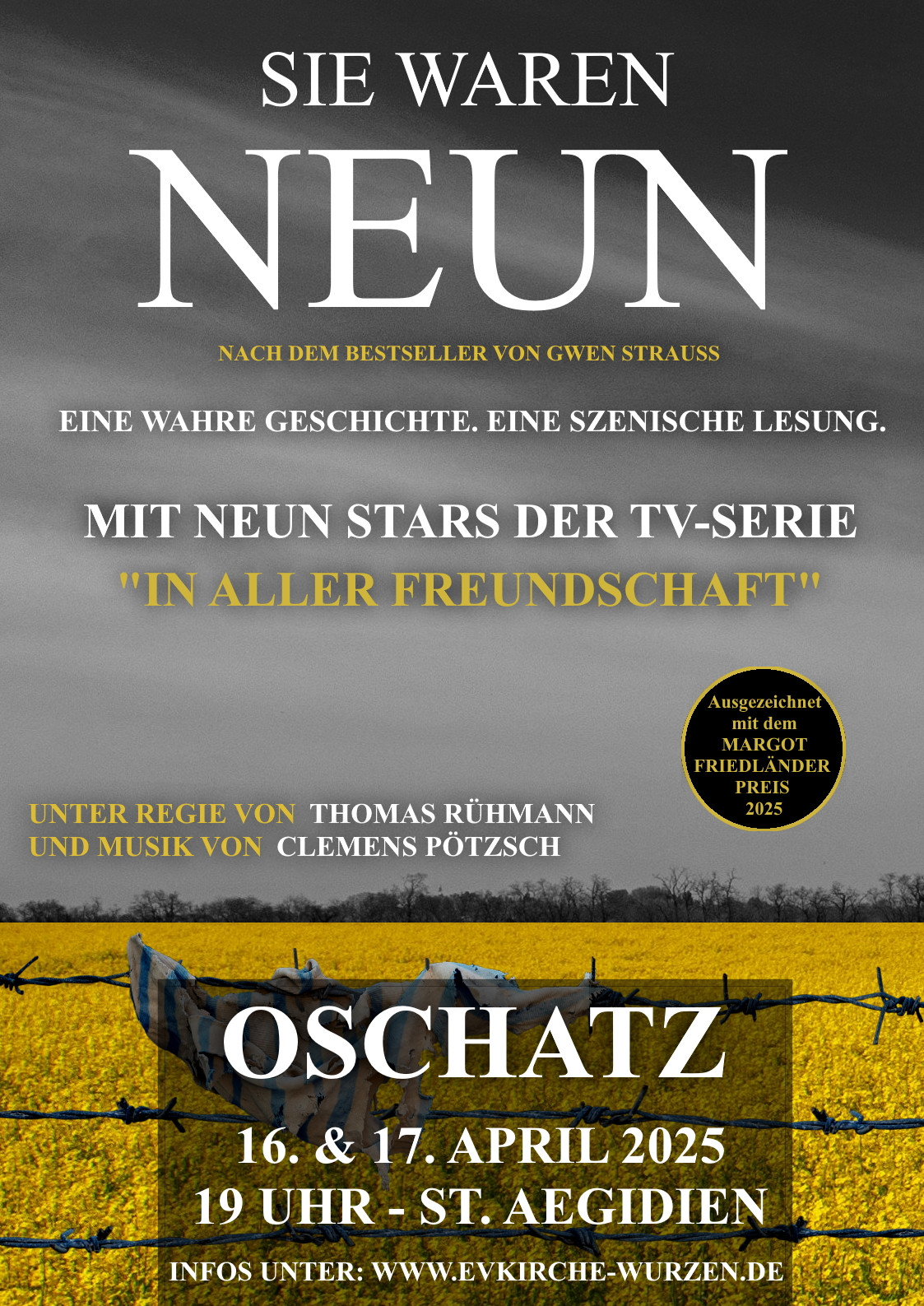 Es ist eine wahre Geschichte, die fast verloren gegangen wäre. Im April 1945 wurden neun junge Frauen, Kämpferinnen der Résistance, auf einen qualvollen Todesmarsch von den HASAG-Werken in Leipzig, über Wurzen bis nach Oschatz getrieben. Doch ihr unbeugsamer Wille und ihre tiefe Freundschaft ließen sie das Unmögliche wagen: die Flucht in die Freiheit durch ein zerfallendes Deutschland mit der ständigen Angst entdeckt und getötet zu werden. Dass wir heute von ihrem Schicksal erfahren, verdanken wir nicht den großen Verlagshäusern, sondern vor allem dem beispiellosen Einsatz junger Menschen. In Eigenregie übersetzten 14 Jugendliche der Evangelischen Jugendarbeit Wurzen unter der Leitung von Diakon Fabian Hanspach sowie den Übersetzerinnen Ina Adler und Dr. Katharina Löffler den 300-seitigen, internationalen Bestseller THE NINE von Gwen Strauss, und brachten ihn, dank des lokalen SAX-Verlags, als SIE WAREN NEUN auf den deutschen Buchmarkt. Aus diesem Herzensprojekt ist nun eine bewegende szenische Lesung entstanden, die genau 81 Jahre nach den historischen Ereignissen die Stimmen dieser Frauen zurück in die Öffentlichkeit trägt.
